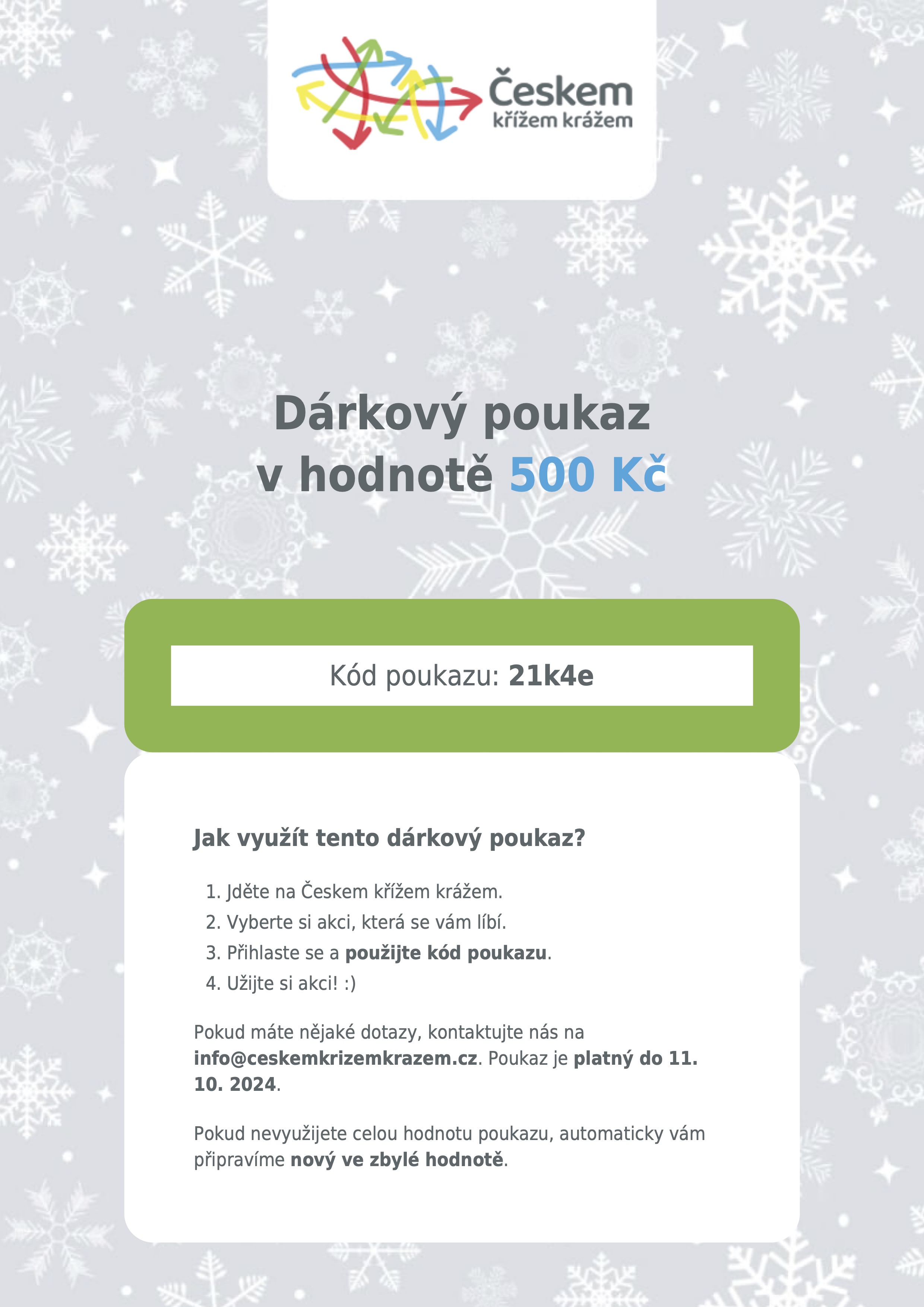 Poukaz je možné využít na vícero akcí: jeho hodnota se bude postupně snižovat. Minimální hodnota je 500 korun. Po zaplacení vám přijde dárkový poukaz na e-mail a můžete jej ihned vytisknout. Prohlédněte si ukázkový poukaz.